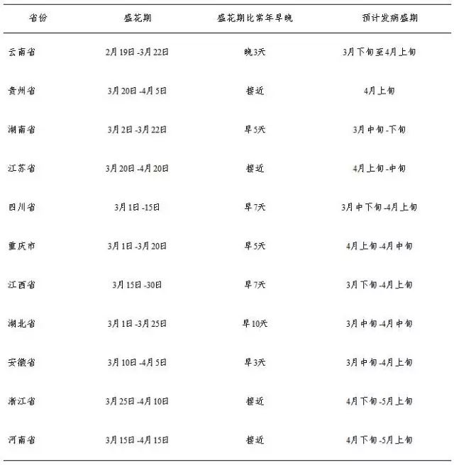 今年,長江流域冬油菜種植面積為9446萬畝,各省平均感病品種比率為65.9 %,比上年增加0.9個百分點。目前,云南、貴州、湖南、江西、湖北、安徽,以及浙江南部處于盛花期至花莢期,四川、重慶、江蘇、河南、陜西、上海,以及浙江北部處于始花期至盛花期,與上年同期相比,大部分地區(qū)花期比常年提早3-7天,最高提早10天,花器易感期與子囊孢子發(fā)生期相吻合時間長,有利于病菌侵染。預計各地花期和發(fā)病盛期見表2。