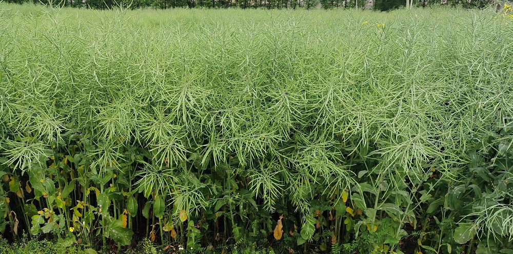 特征特性:該品種為甘藍型半冬性油菜雜交種,全生育期平均230.5天。幼苗半直立,葉片綠色,裂葉3~4對,葉緣鋸齒,表面有輕微臘粉,無刺毛?;ㄉS,花瓣大、側(cè)疊。勻生分枝類型,分枝習性強,角果密,籽粒黑褐色。在每畝2.0萬株密度下,平均株高152.4厘米,分枝部位62.2厘米,平均單株有效角果數(shù)249.2個,結(jié)角密度1.24個/厘米,每角粒數(shù)22.1粒,千粒重4.2克。食用油芥酸含量0.082%,硫苷含量22.49~23.03微摩爾/克,含油量46.03%~47.12%。抗菌核病,中抗病毒病,抗寒性較強,抗裂莢性中等,抗倒性強。